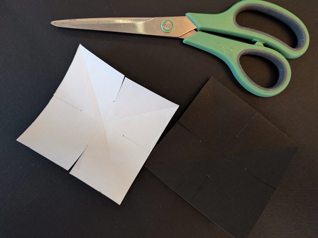 Sur chaque carré, découpez le long des plis horizontaux et verticaux, en vous arrêtant environ 1,5 cm avant le centre.
