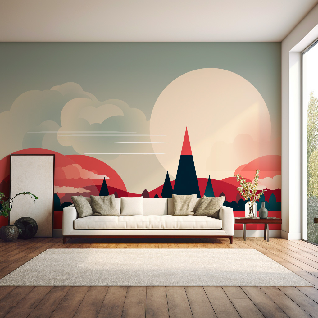 Ce papier peint vous transporte dans un monde de formes géométriques et de lignes élégantes, où les collines se déploient en motifs graphiques et les arbres prennent vie sous des angles audacieux.