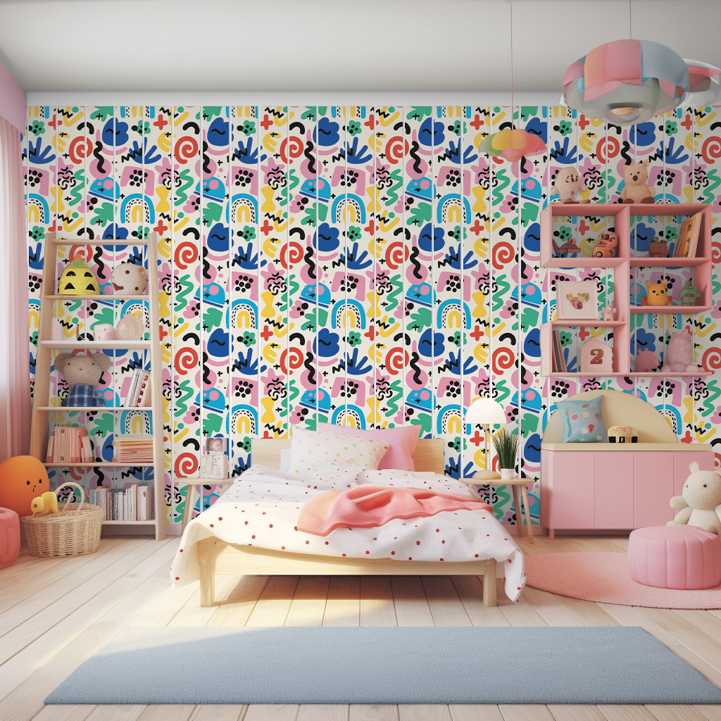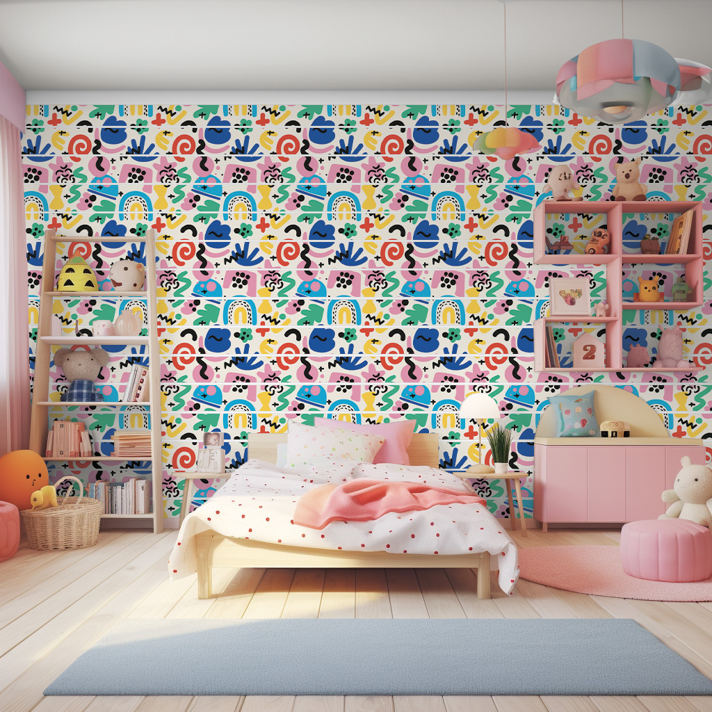 Explorez la vivacité et la créativité avec ce papier peint aux motifs très colorés et vifs, inspirés des dessins d’enfants.