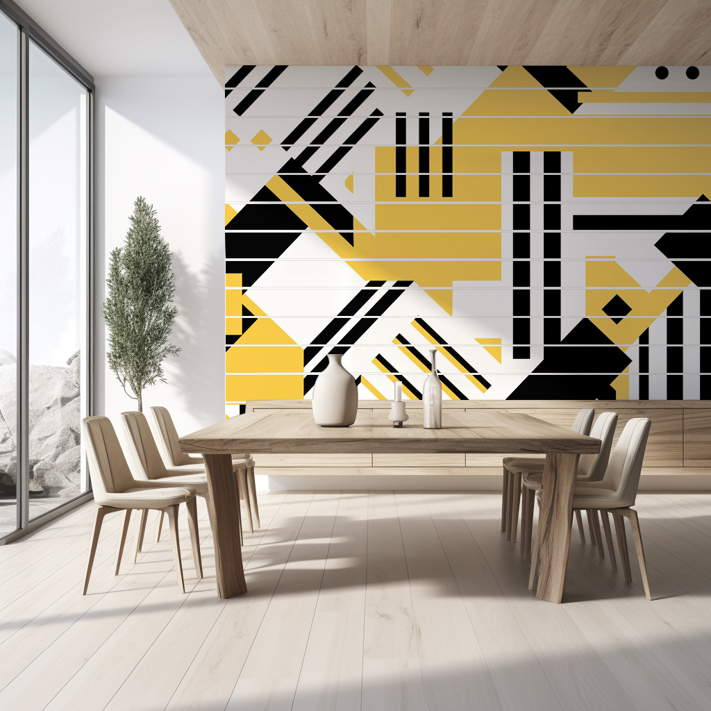 Ce design graphique et élégant crée une atmosphère urbaine et avant-gardiste, parfaite pour un espace de vie moderne.