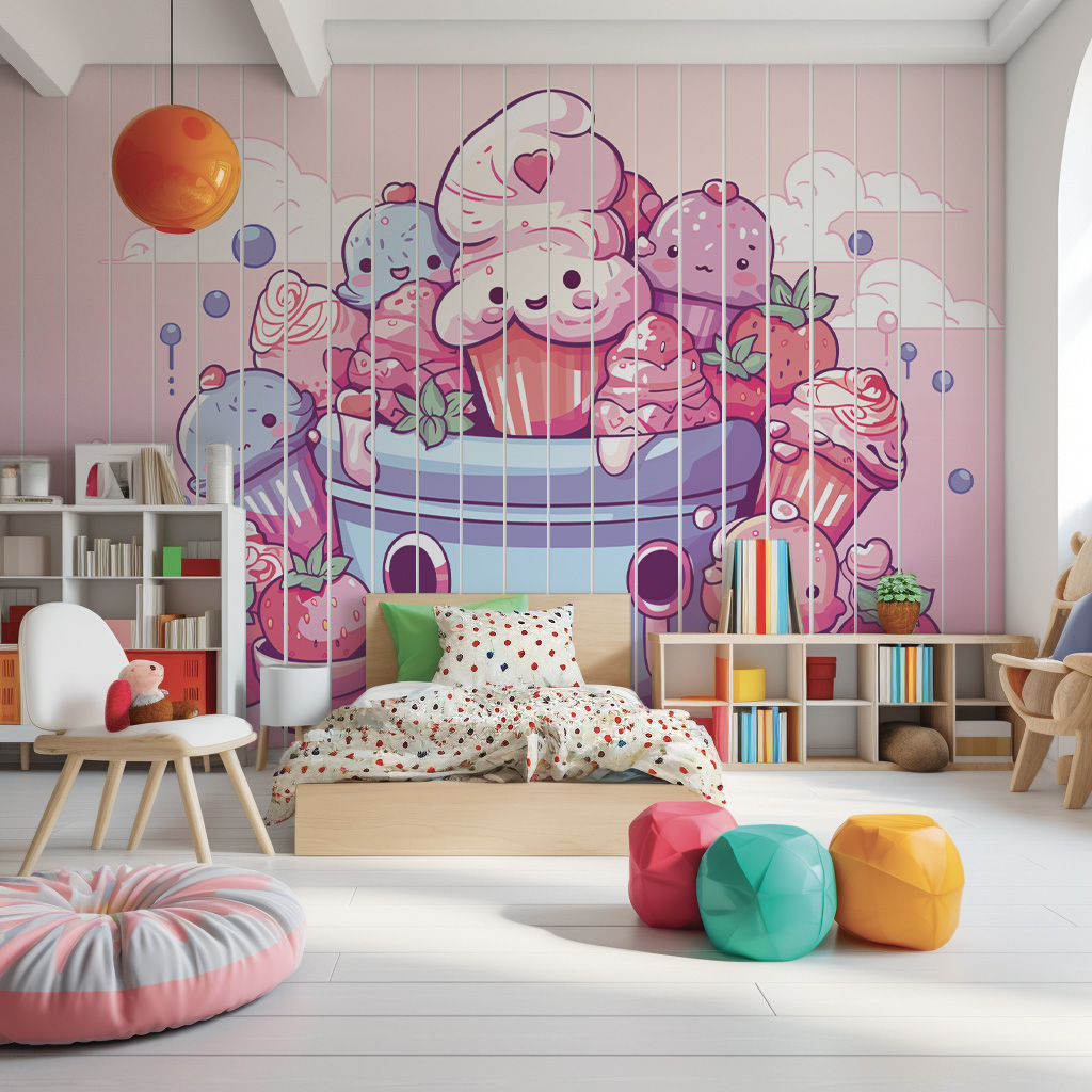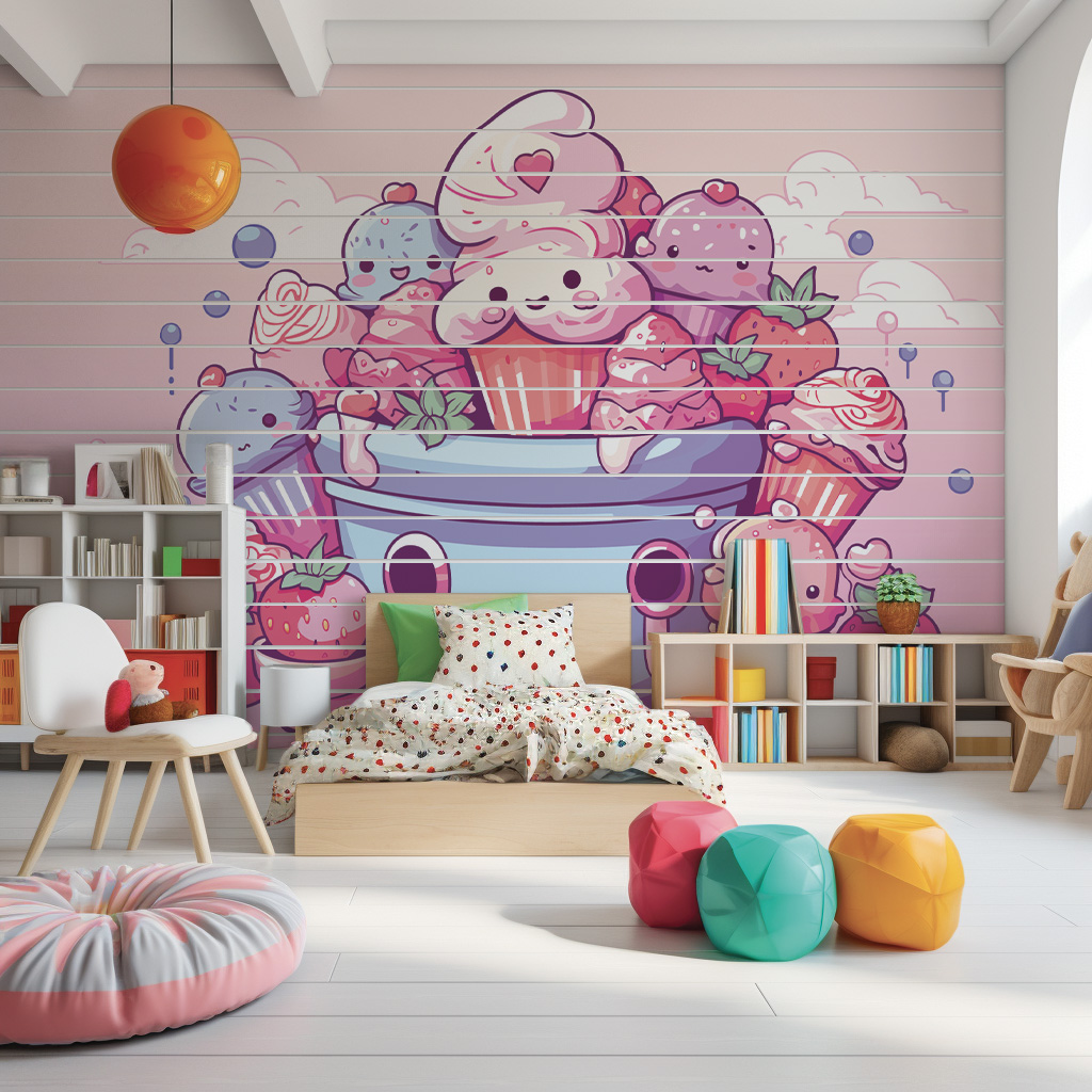 Un papier peint kawaii avec des personnages en forme de glace pour une déco joyeuse et gourmande.