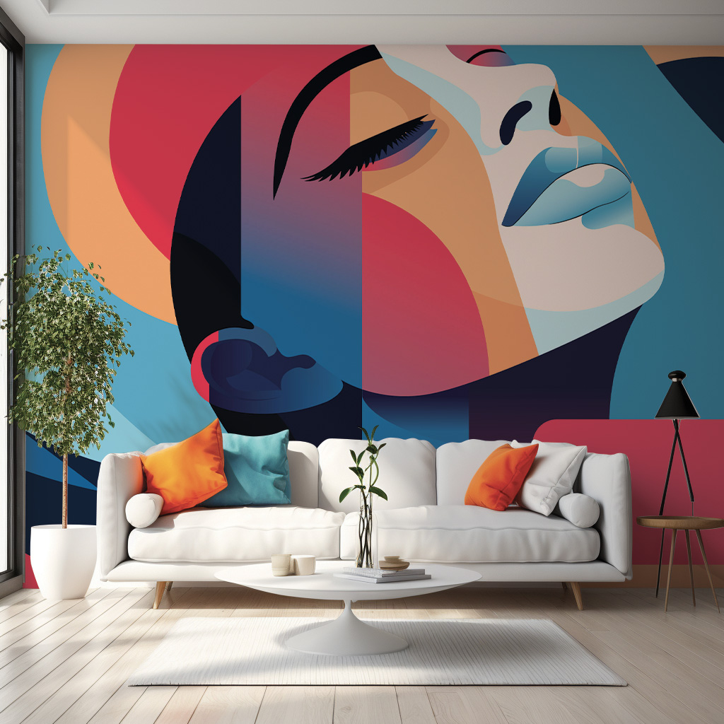Un papier peint coloré et géométrique mettant en scène un visage féminin stylisé.