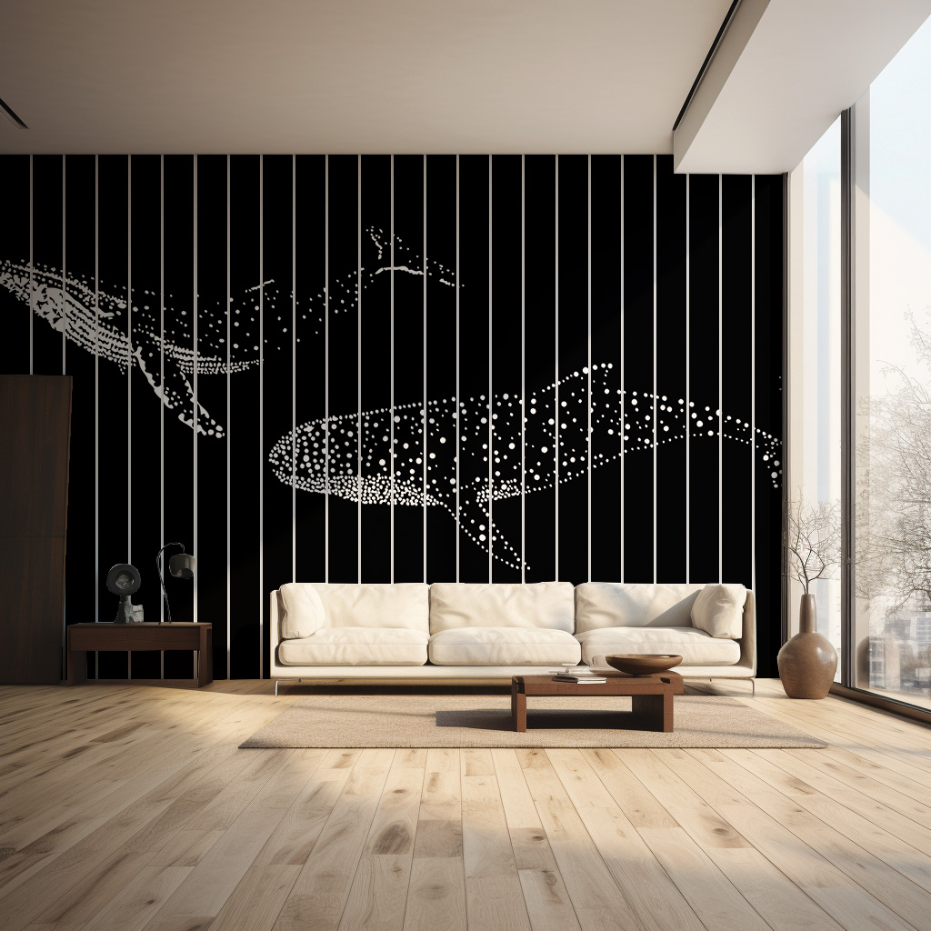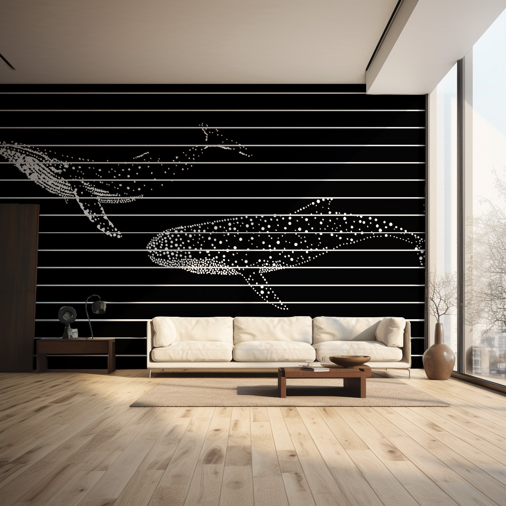 Un papier peint zen avec des baleines en silhouette sur fond noir, pour une déco sereine et élégante.