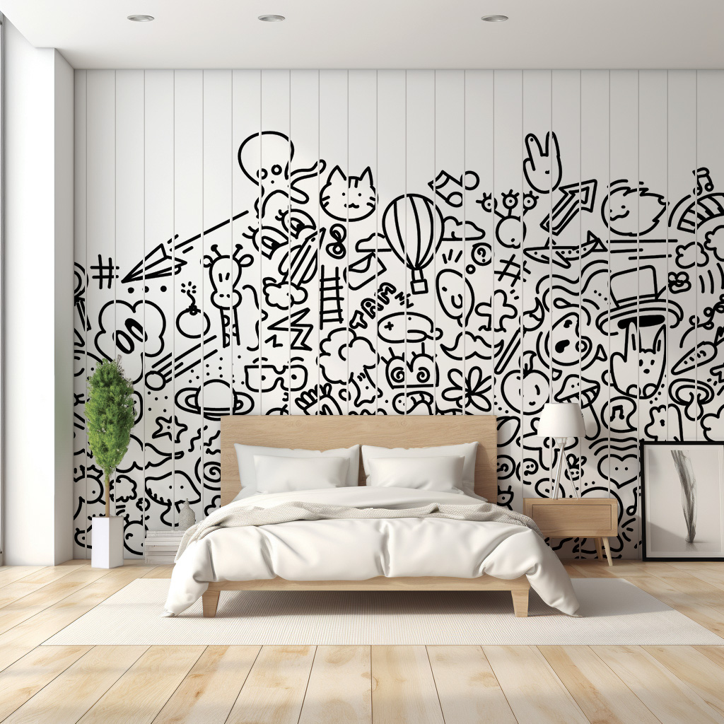 Laissez libre cours à votre créativité avec notre papier peint au style «sketch», noir et blanc, où des motifs et des personnages dessinés prennent vie sous vos yeux.